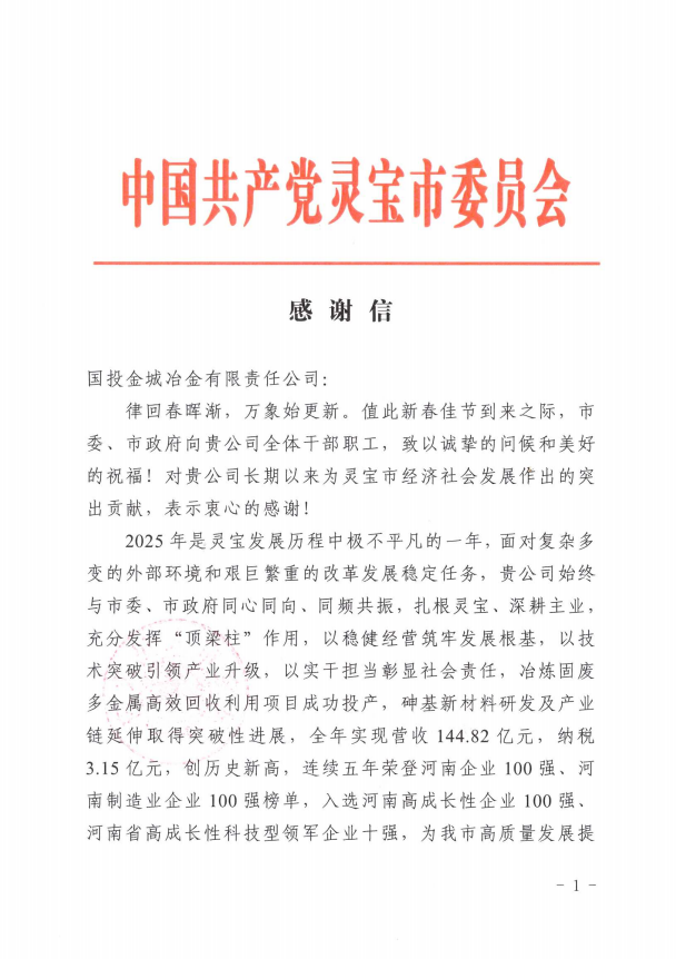 灵宝市委市政府致感谢信|国投金城冶金2025年营收纳税双创新高