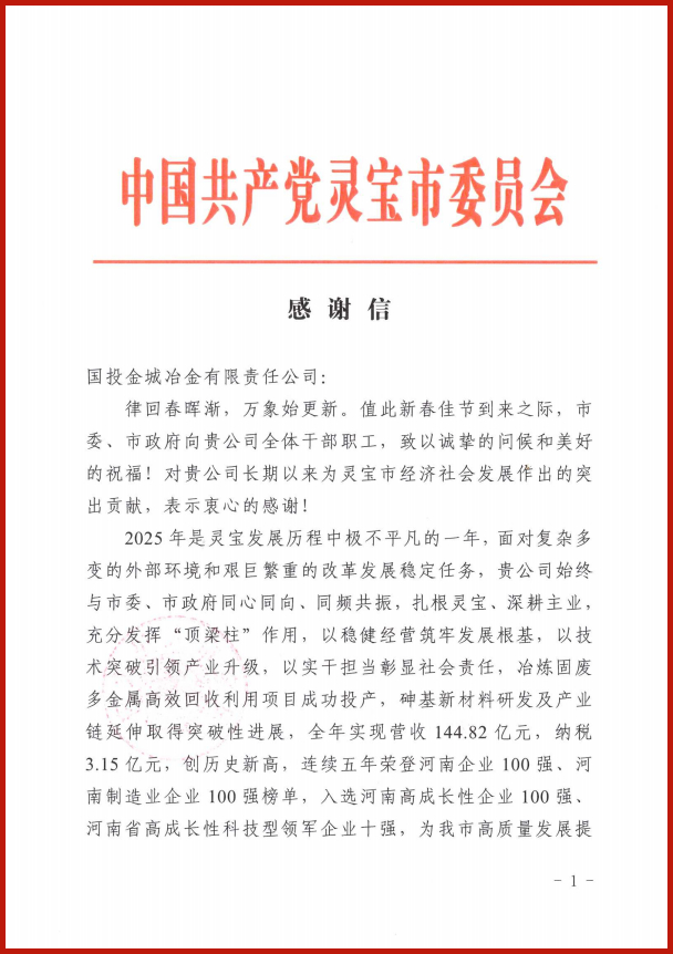灵宝市委市政府致感谢信|国投金城冶金2025年营收纳税双创新高