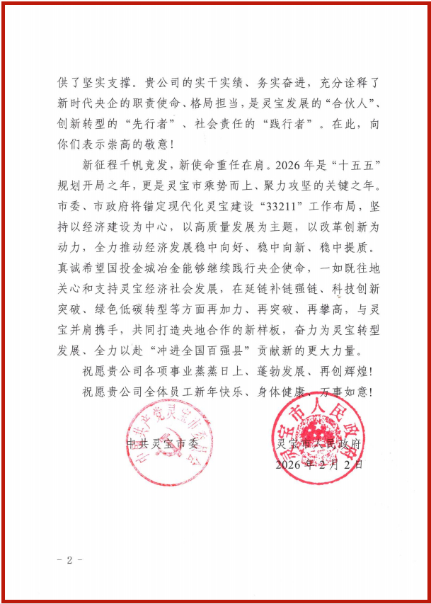 2026-02-052月2日,河南省灵宝市委、市政府向公司发来感谢信,感谢公司为灵宝市经济社会发展作出的突出贡献,对公司2025年取得的经营业绩表示祝贺。